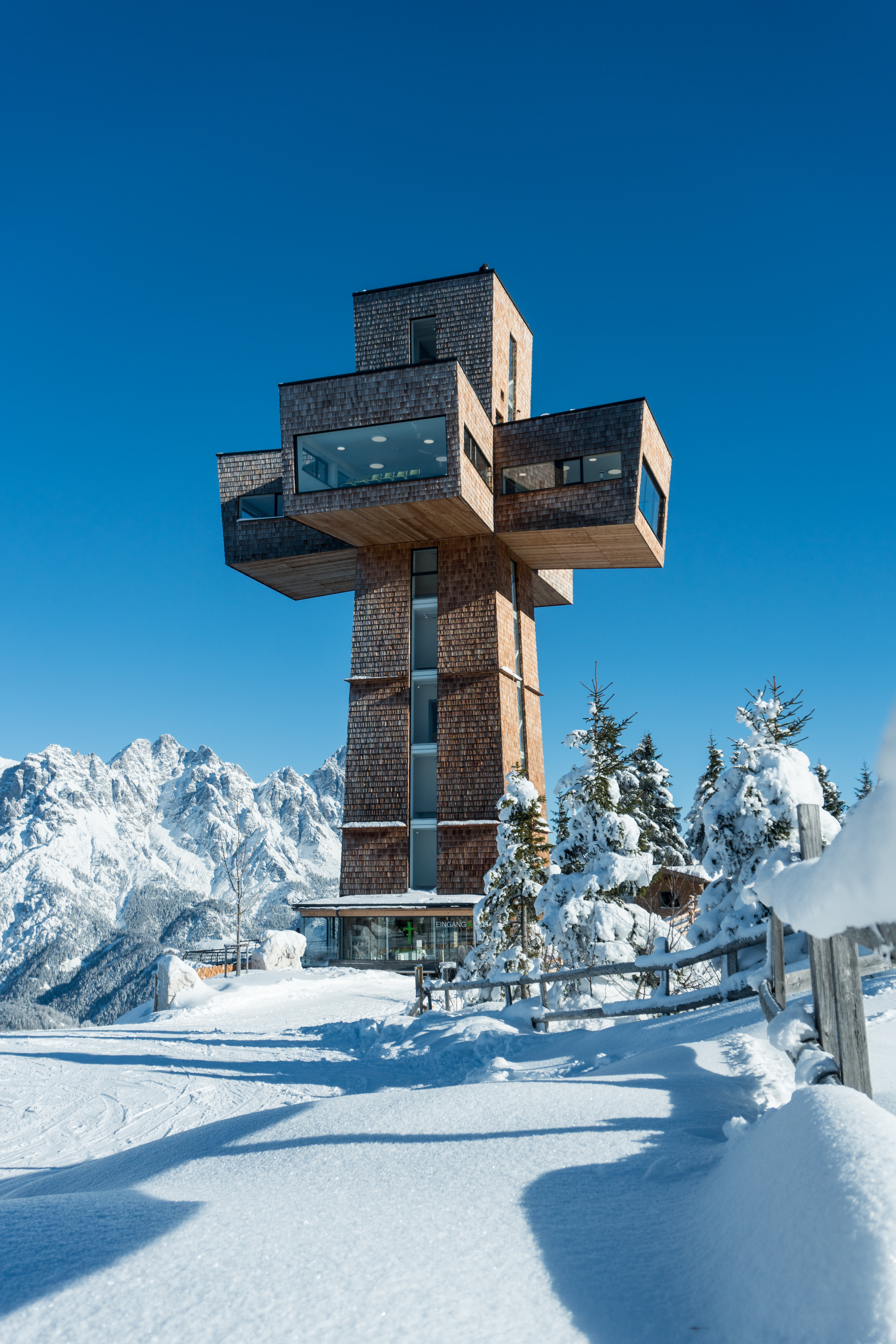 Schon aus der Ferne ist das Jakobskreuz am Gipfel der Buchensteinwand im Pillerseetal zu sehen. Fast 30 Meter ragt es in die Höhe und ist ein idealer Platz für Seminare und Meetings.