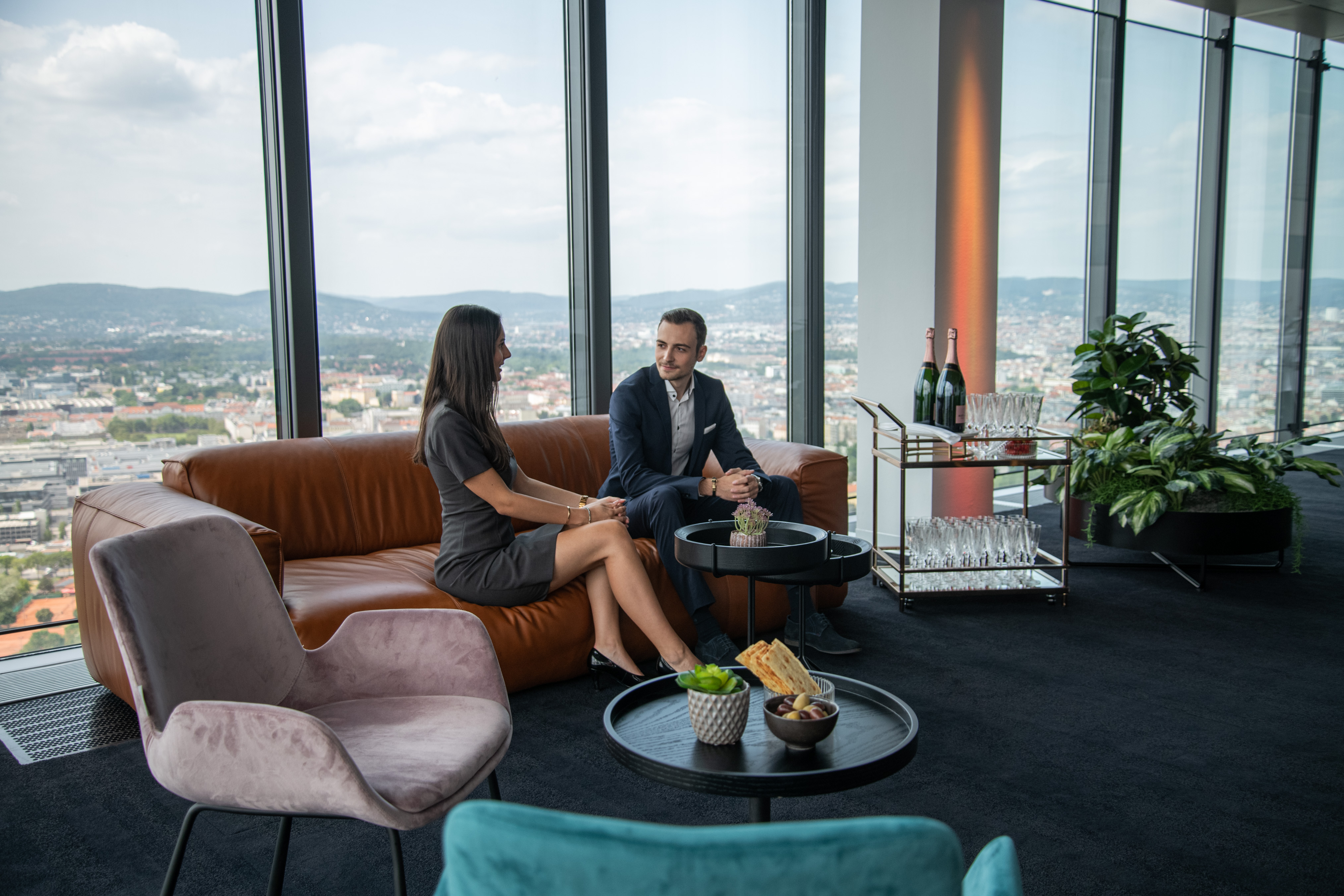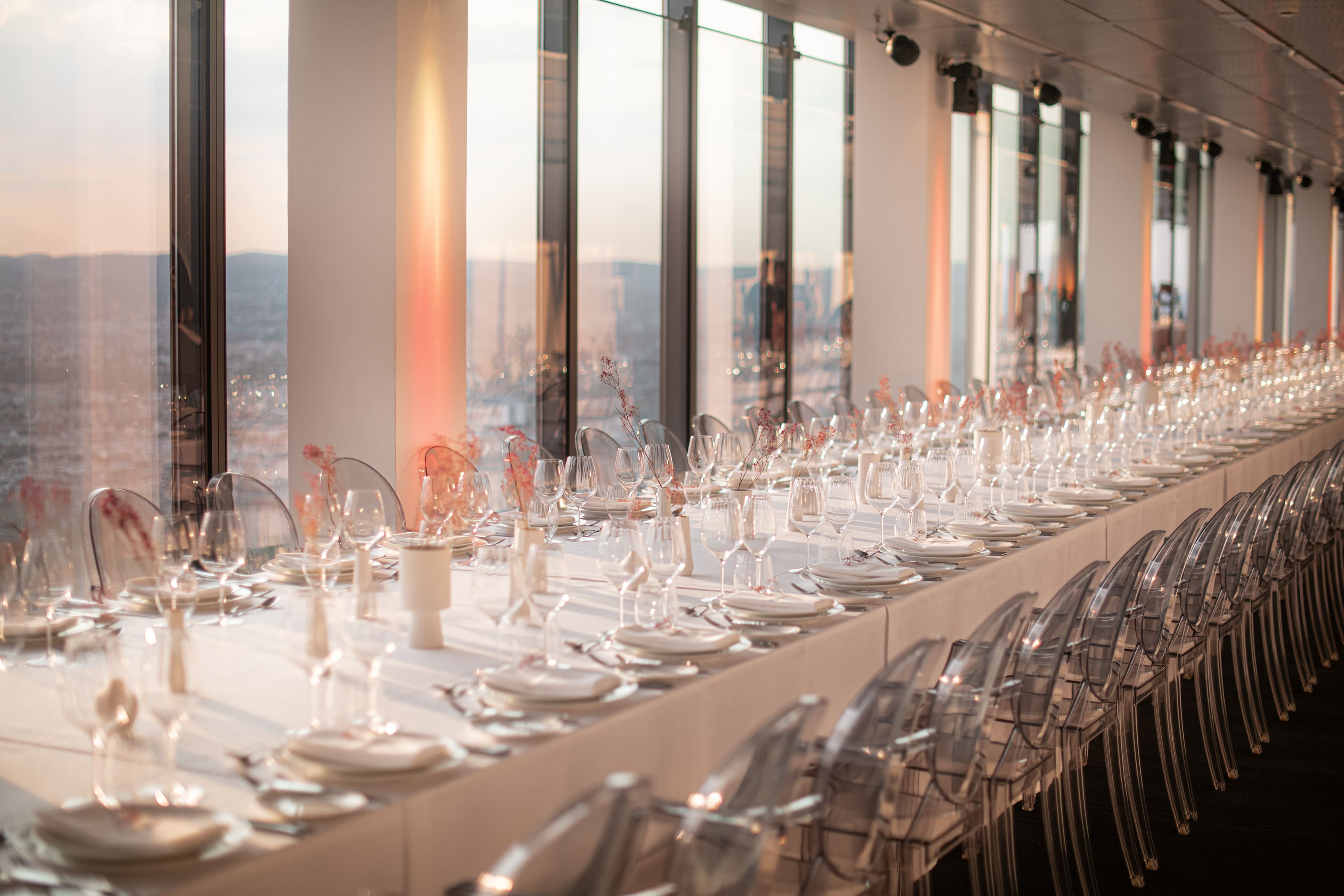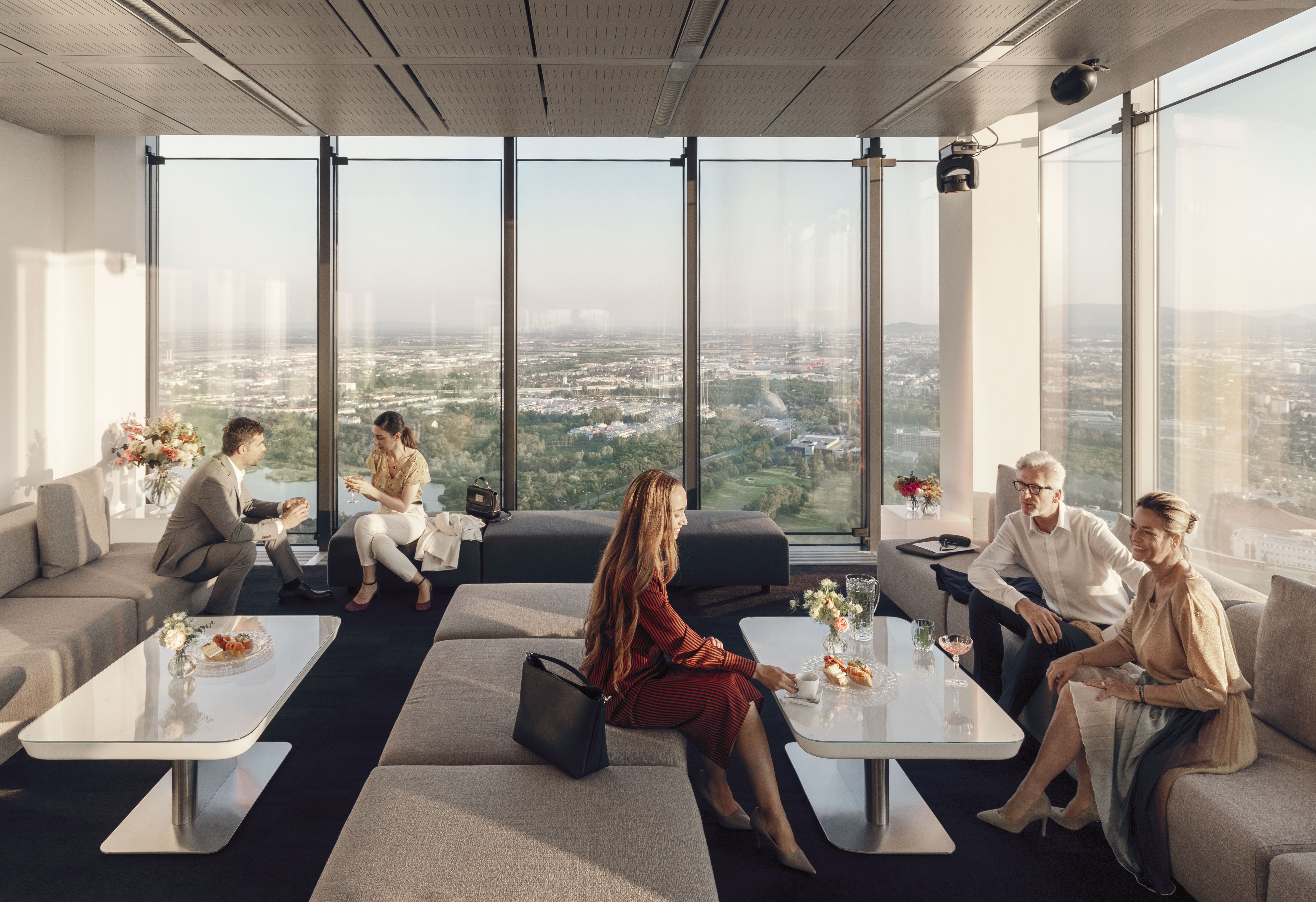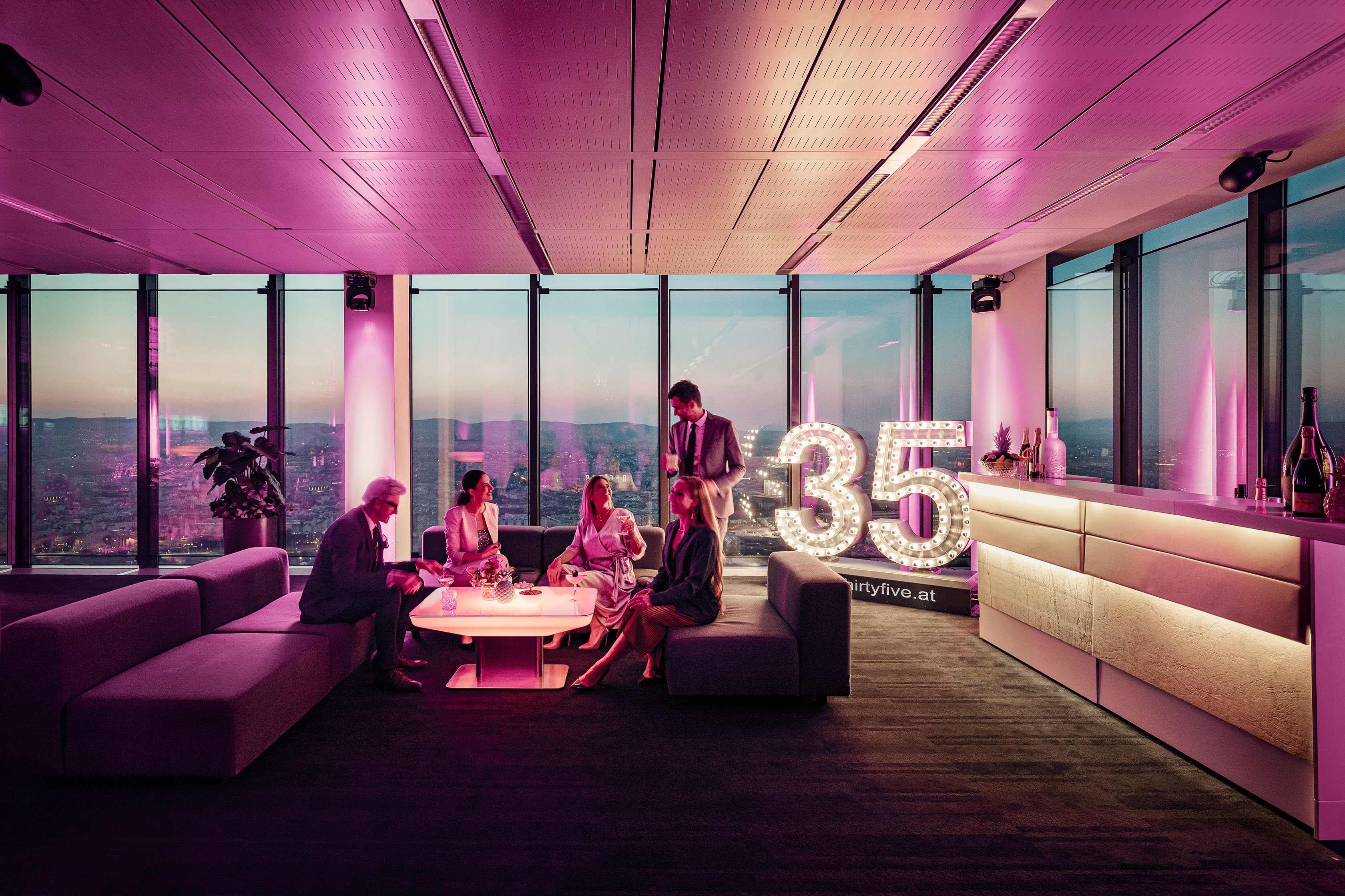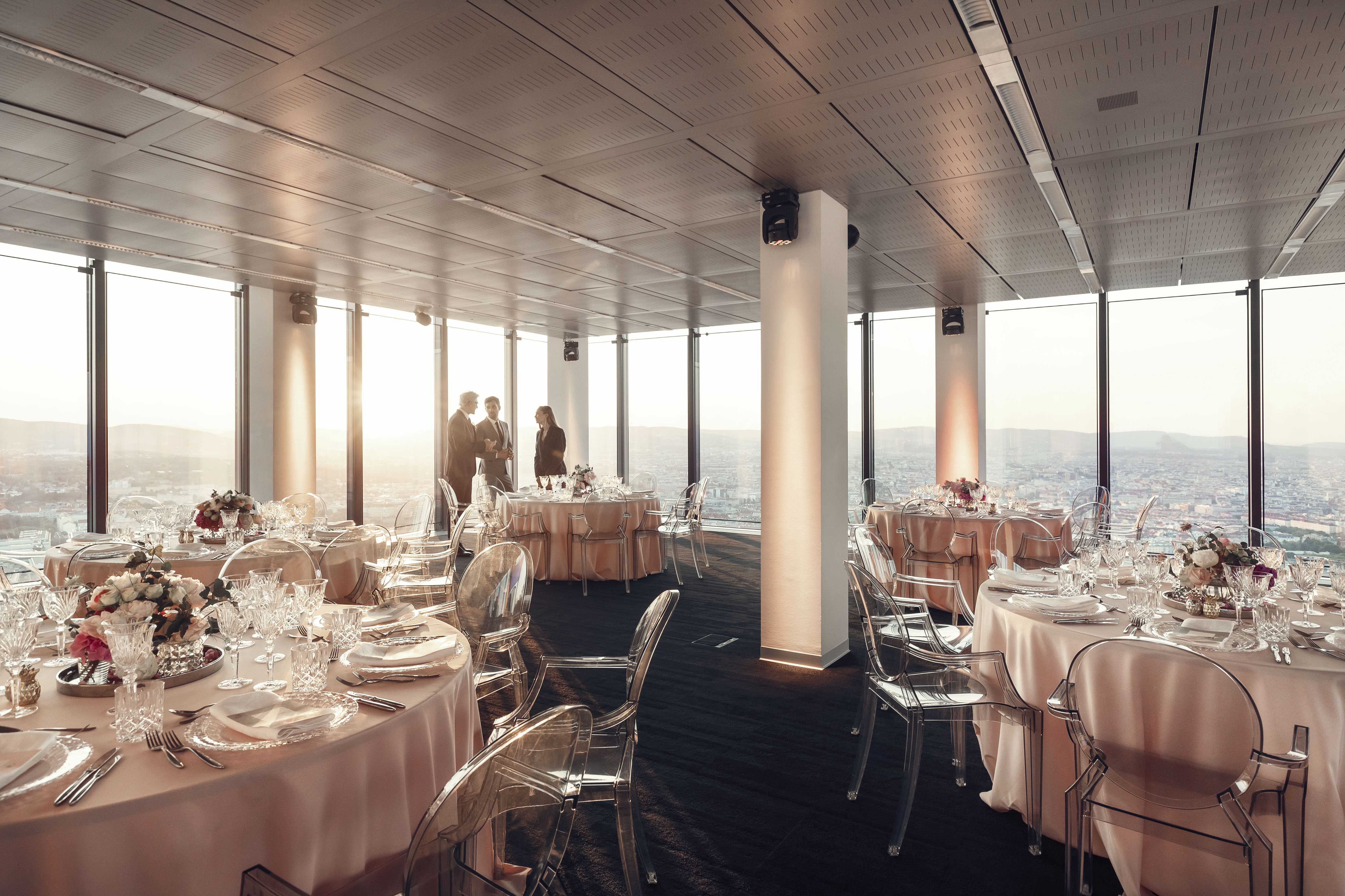 Im 35. Stockwerk, dem Penthouse des „Vienna Twin Tower“, erwarten Sie in der höchstgelegenen Eventlocation Wiens, voll ausgestattete und multifunktional bespielbare Eventräumlichkeiten der besonderen Art. Italienisches Designmobiliar, Gala- und Seminarbestuhlung und hochmoderne technische Komplettausstattung lassen jedes Veranstalterherz höher schlagen. Genießen Sie nicht nur den 360° Rundumblick über ganz Wien in luftiger Höhe von 382m über Null, sondern beeindrucken Sie Ihre Gäste auch mit diesen Highlights: - 600m² multifunktionale Event- und Seminarräumlichkeiten - Variables Bestuhlungs- und Raumtrennungskonzept - 70" Multi-Touchscreen & Präsentationsdisplays für Ihre Vorträge - 16 Full-HD Public-Displays für die Inszenierung Ihrer Images & Videos - LED Moving-Heads für jegliche Farbinszenierungen & Branding in Ihren CI-Farben - High-End Audiosystem mit Funk- Hand&Headsets für kristallklaren Klang - Kostenlose Parkplätze in der hauseigenen Tiefgarage.