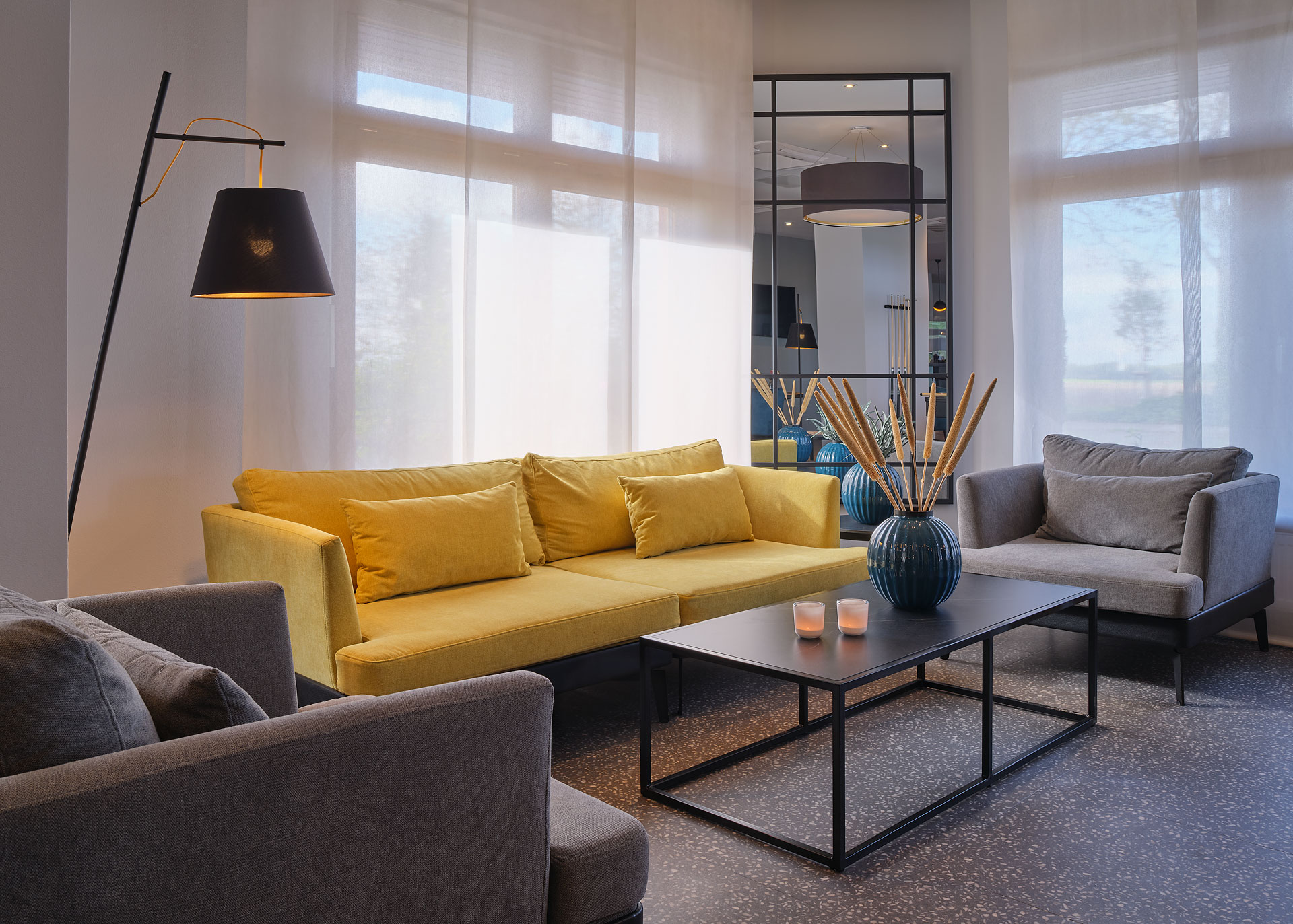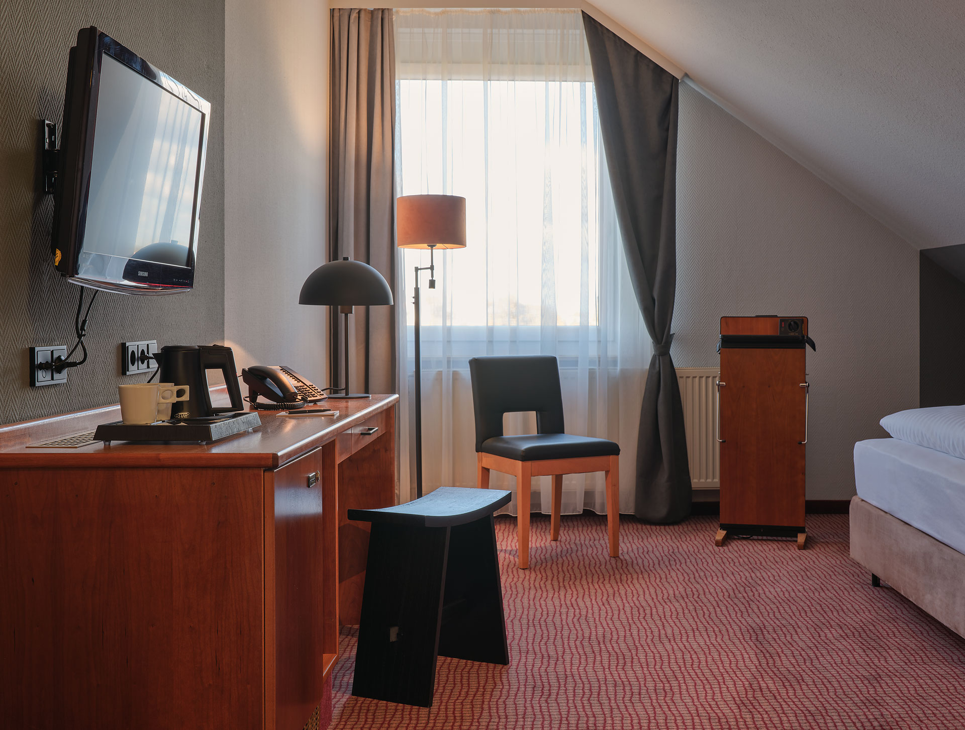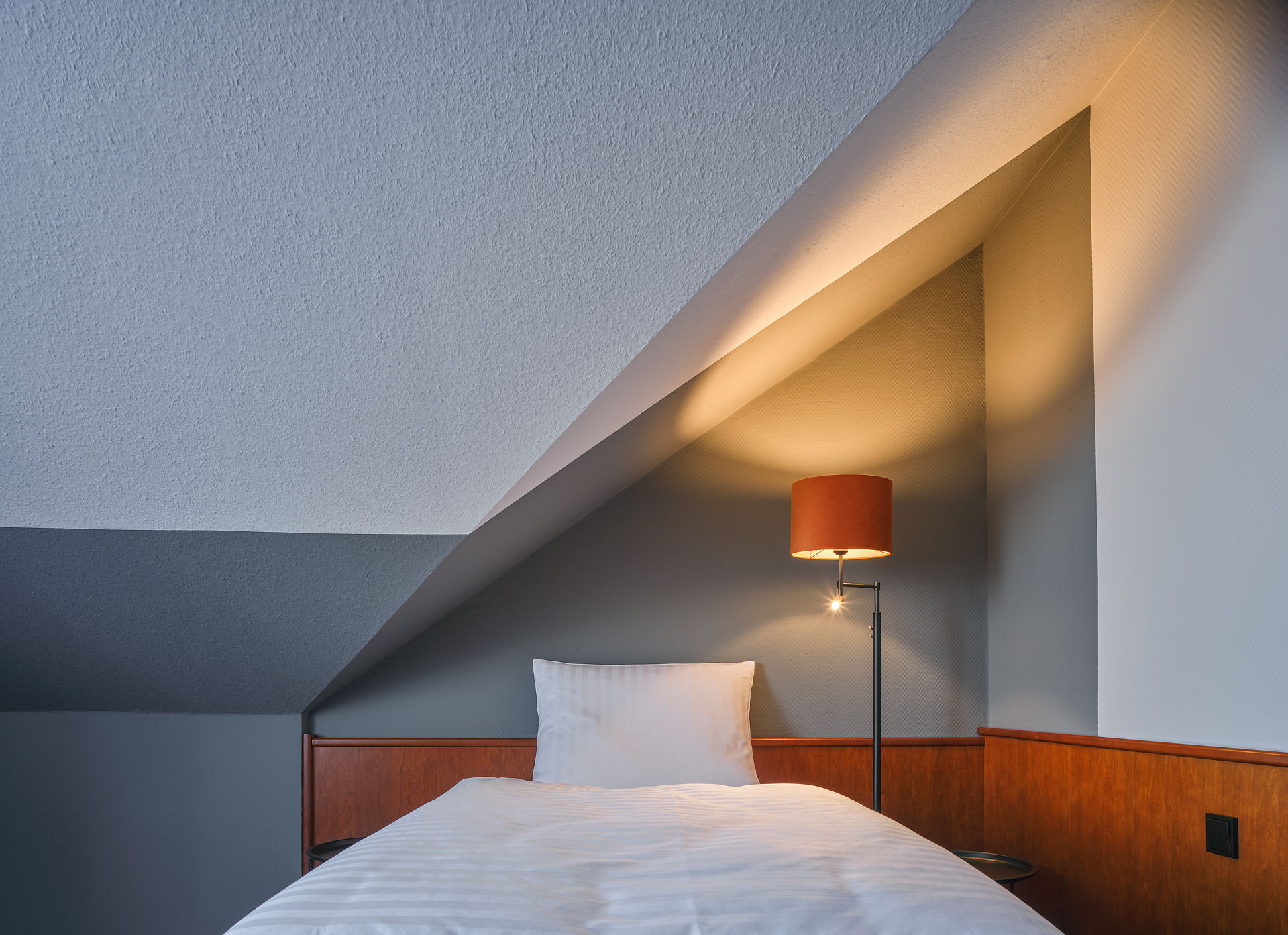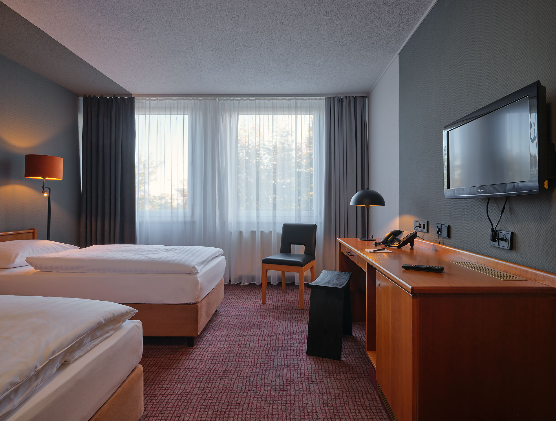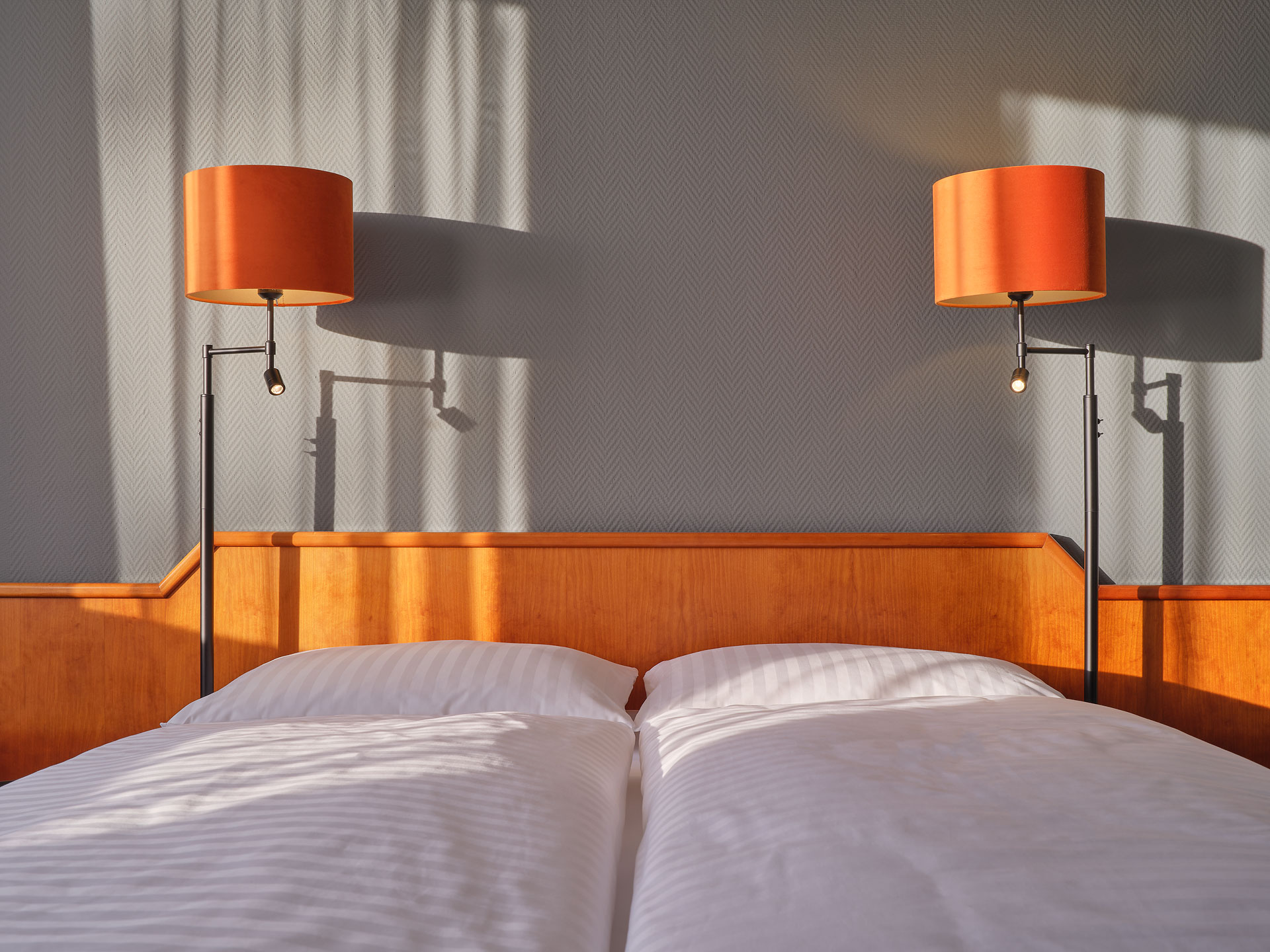 Über 3 Etagen verteilen sich 109 gemütlich eingerichtete und geräumige Zimmer, deren akzentuierte Grautöne und ausgewählte Lampendetails eine behagliche Stimmung garantieren. Lassen Sie sich von der Morgensonne wecken und genießen Sie den traumhaften Blick in die Natur.