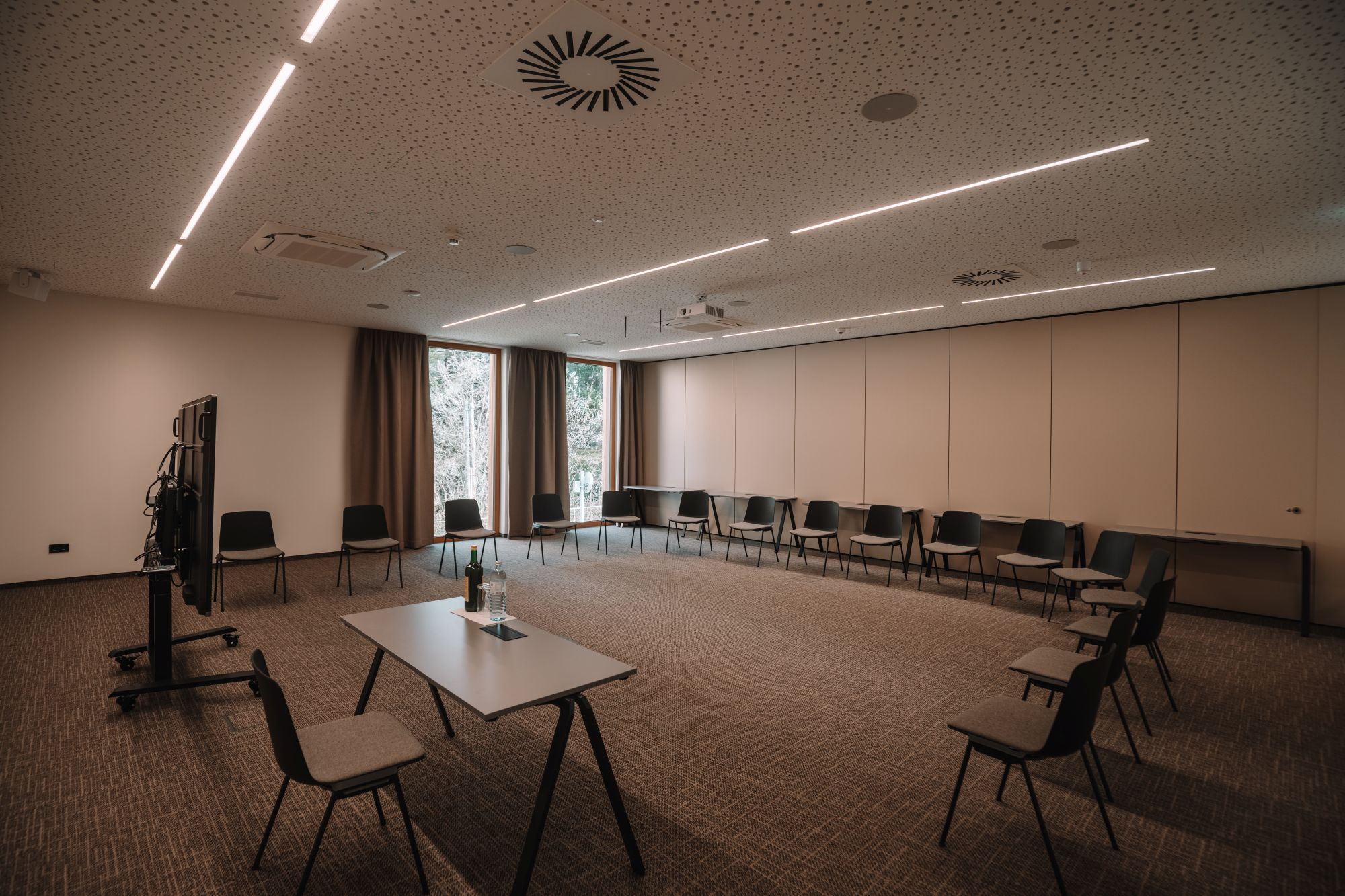 - Beamer, Leinwand, Flipcharts, Pinnwände, Mikrofon & Audioanlage