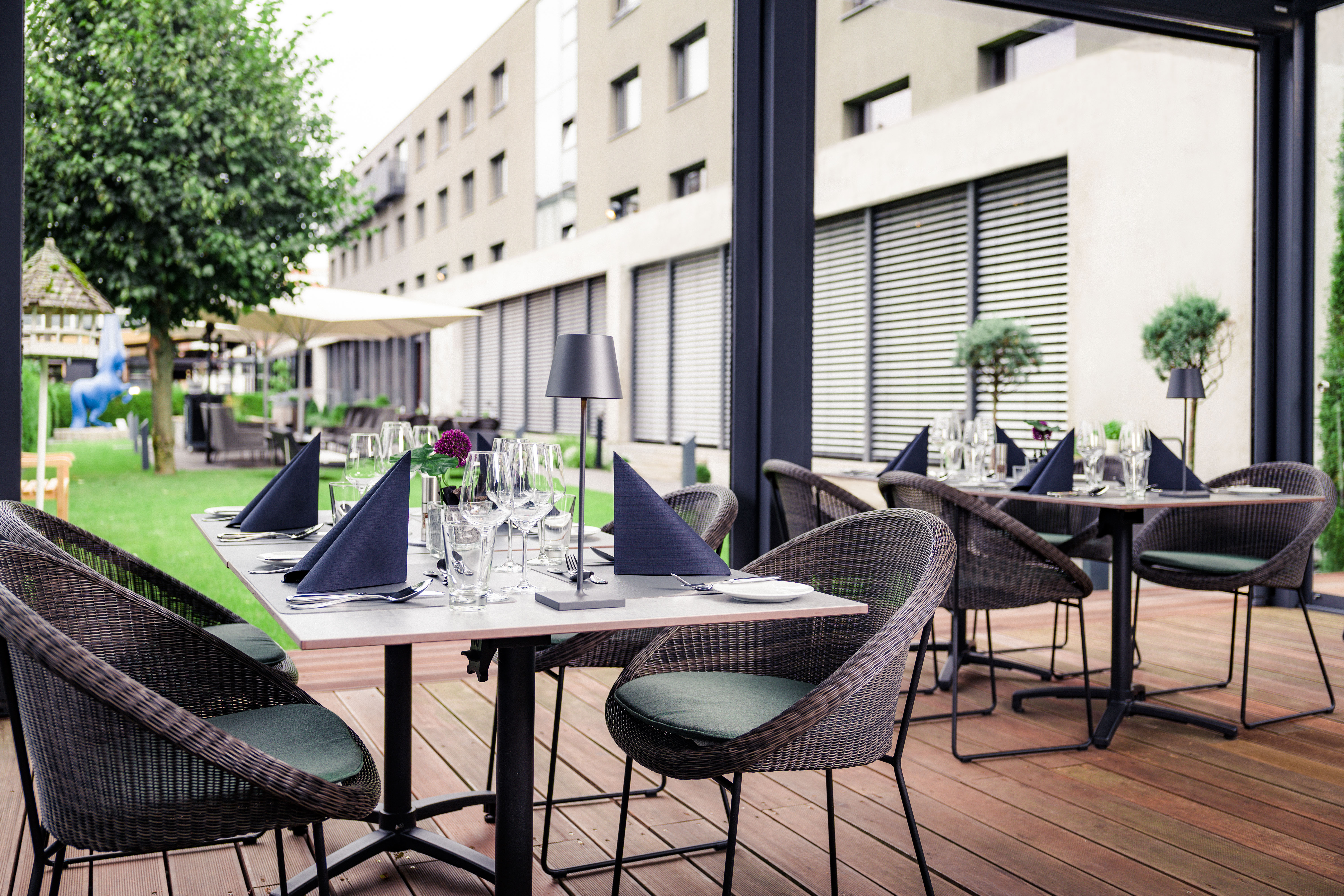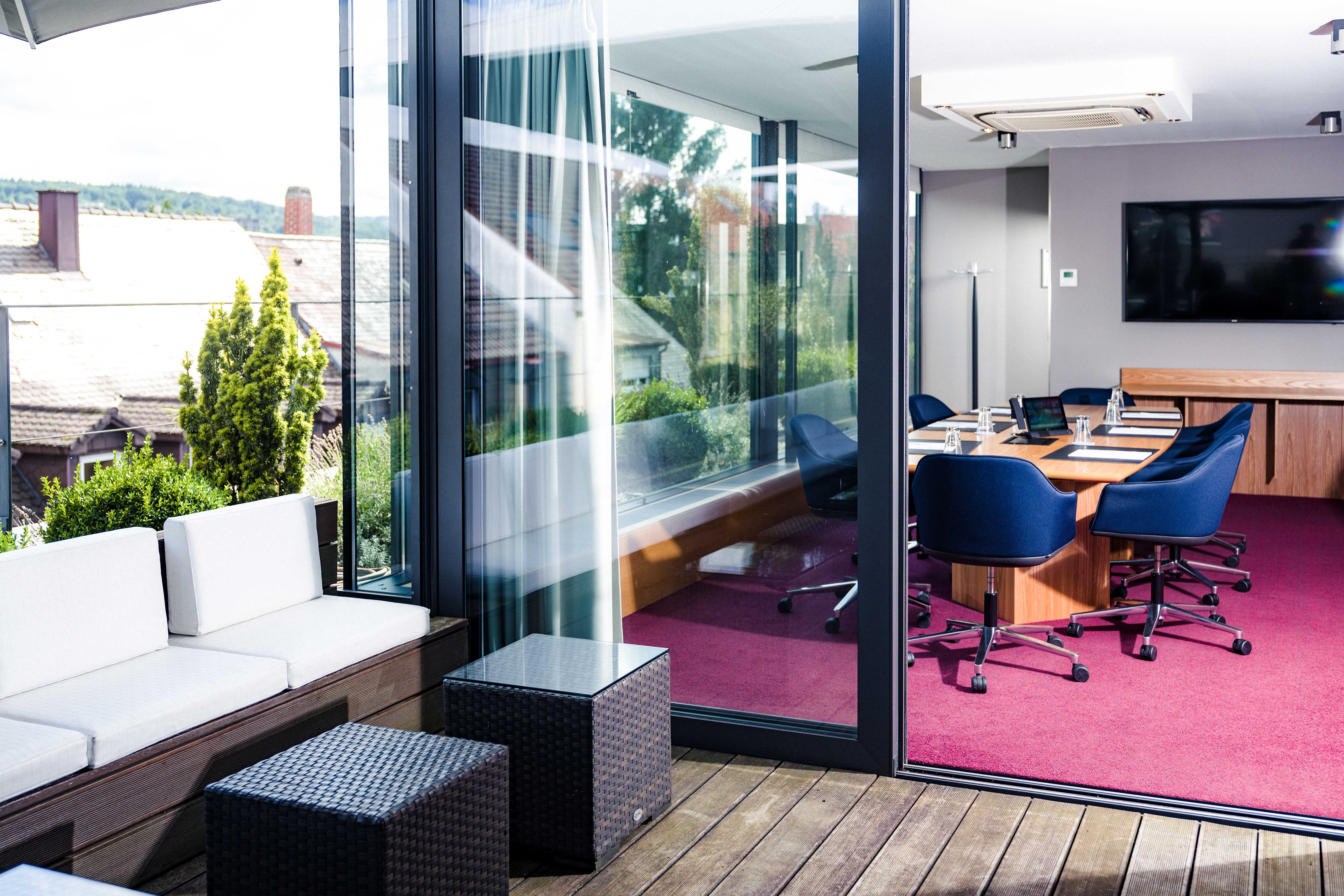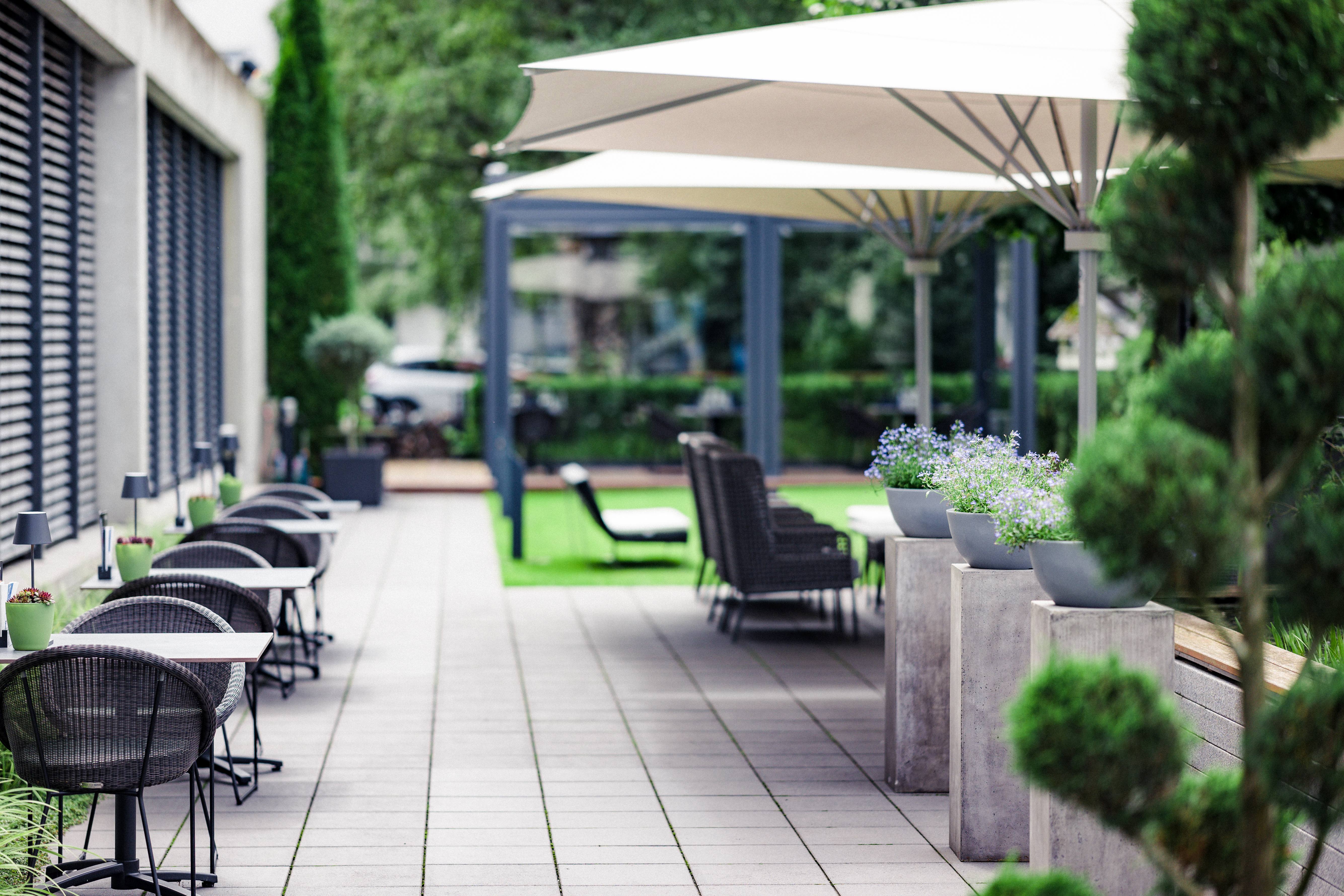 Der angrenzende Hotelgarten kann optimal für Sommerfeste, Grillveranstaltungen und entspannte Abende in der Sommerlounge genutzt werden. Durch die bodentiefen Fenster in den Tagungsräumen im EG gibt es einen direkten Zugang zum Hotelgarten – auch optimal für breakout-sessions.