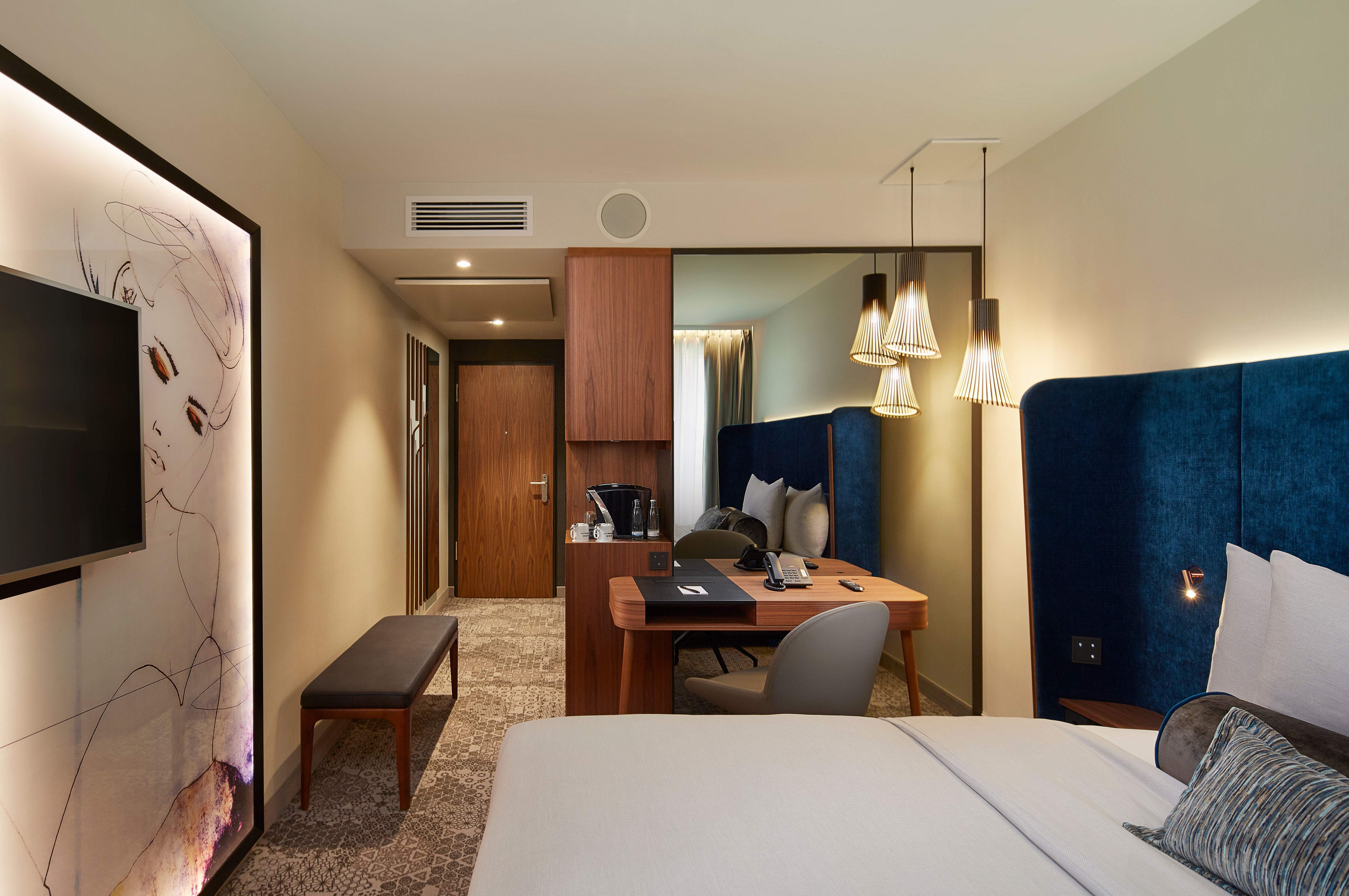 Dazu gehören die Betten mit Wellness-Toppern genauso wie die individuell regulierbare Klimaanlage, aber auch die Badezimmer mit Fußbodenheizung und Regenwalddusche. Zur weiteren Einrichtung gehören Designersessel, ein Schreibtisch, ein Safe und eine Minibar. Inklusive für Sie ist neben der WLAN-Nutzung, Sky-Sport-TV und hochwertigen Kosmetikartikeln auch die Nutzung des Fitness-Bereichs. In allen Zimmern stehen Ihnen ein Wasserkocher mit einer exklusiven Teeauswahl und ein Kaffee-/Espressoautomat zur Verfügung. Einige der Business Zimmer haben eine Badewanne. Die Studios verfügen über einen eigenen Balkon, eine Sitzecke mit Sofa und die Nutzung der Minibar ist in dieser Zimmerkategorie inbegriffen.