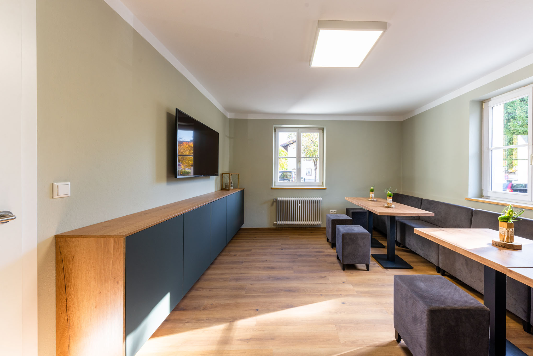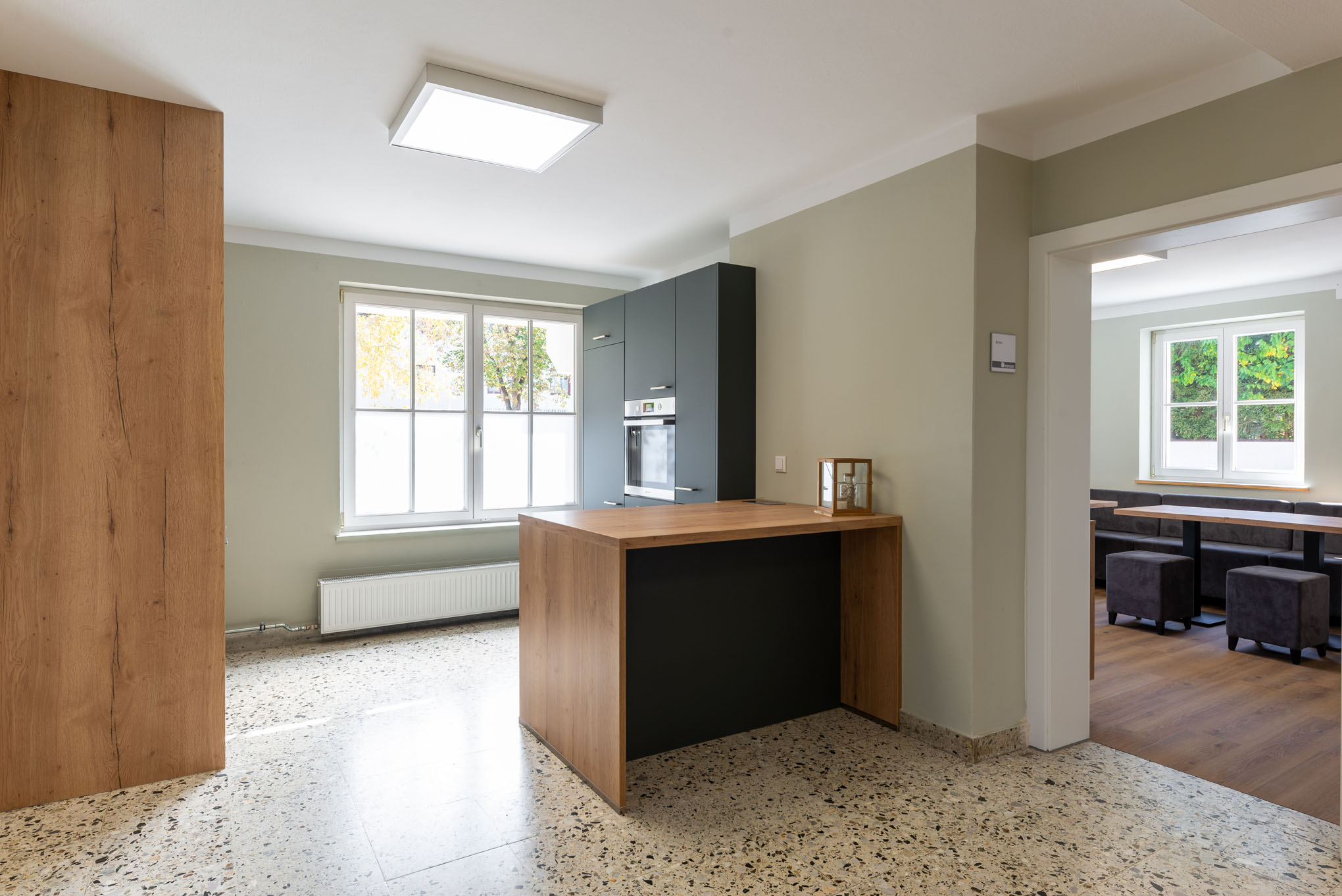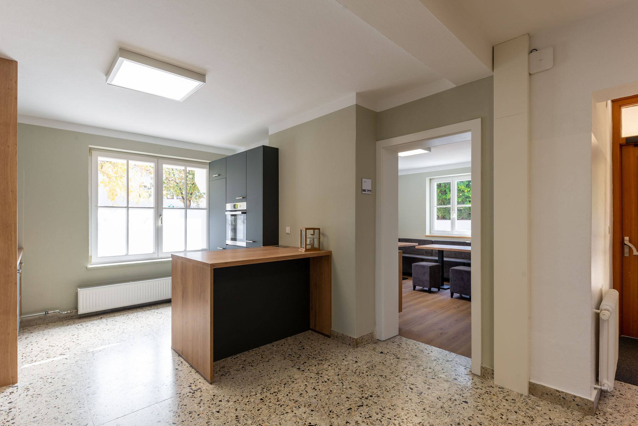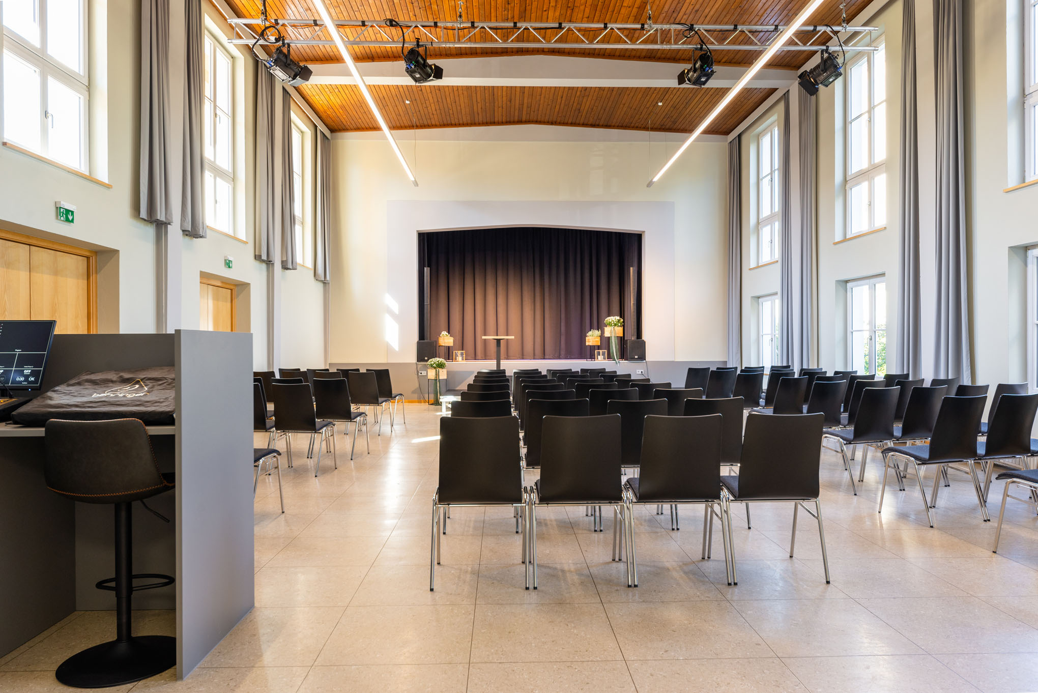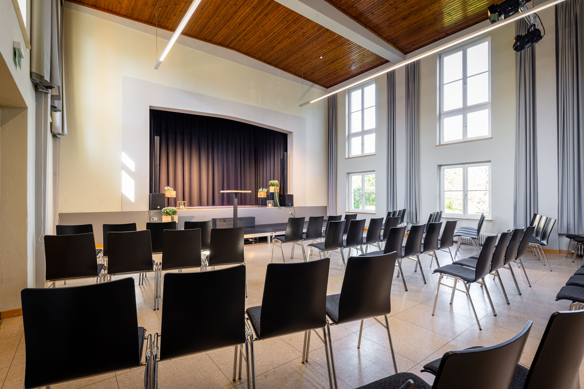 Das geschmackvoll eingerichtete Haus überzeugt bereits mit seinem barrierefrei zugänglichen Erdgeschoss: mit einladendem Foyer, großzügigem Veranstaltungssaal mit Bühne, Begegnungsraum und Küche. Im ersten Stockwerk der Location befindet sich ein heller und geräumiger Seminarraum.