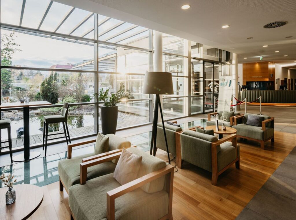 Das Thermenresort Laa liegt nur rund 1 Stunde von Wien entfernt und ist auch öffentlich sehr gut erreichbar (S1 von Wien Nord zum Bahnhof Laa/Thaya) Kommen Sie hier in den Genuss einer ruhigen und persönlichen Atmosphäre für Ihre Tagungen und Events. Eingebettet in eine ruhige, idyllische Umgebung, kombiniert unser 4*Superior Hotel moderne Ausstattung im exklusiven Seminarbereich mit außergewöhnlichem Wohlfühl-Ambiente. All unsere 122 Zimmer & Suiten sind großzügig angelegt und mit überdachter Loggia – sowie mit individuell regulierbarer Klimaanlage, Minibar, Parkettboden, Sitzgelegenheit, hochwertigem Joka-Boxspringbett und vielem mehr.